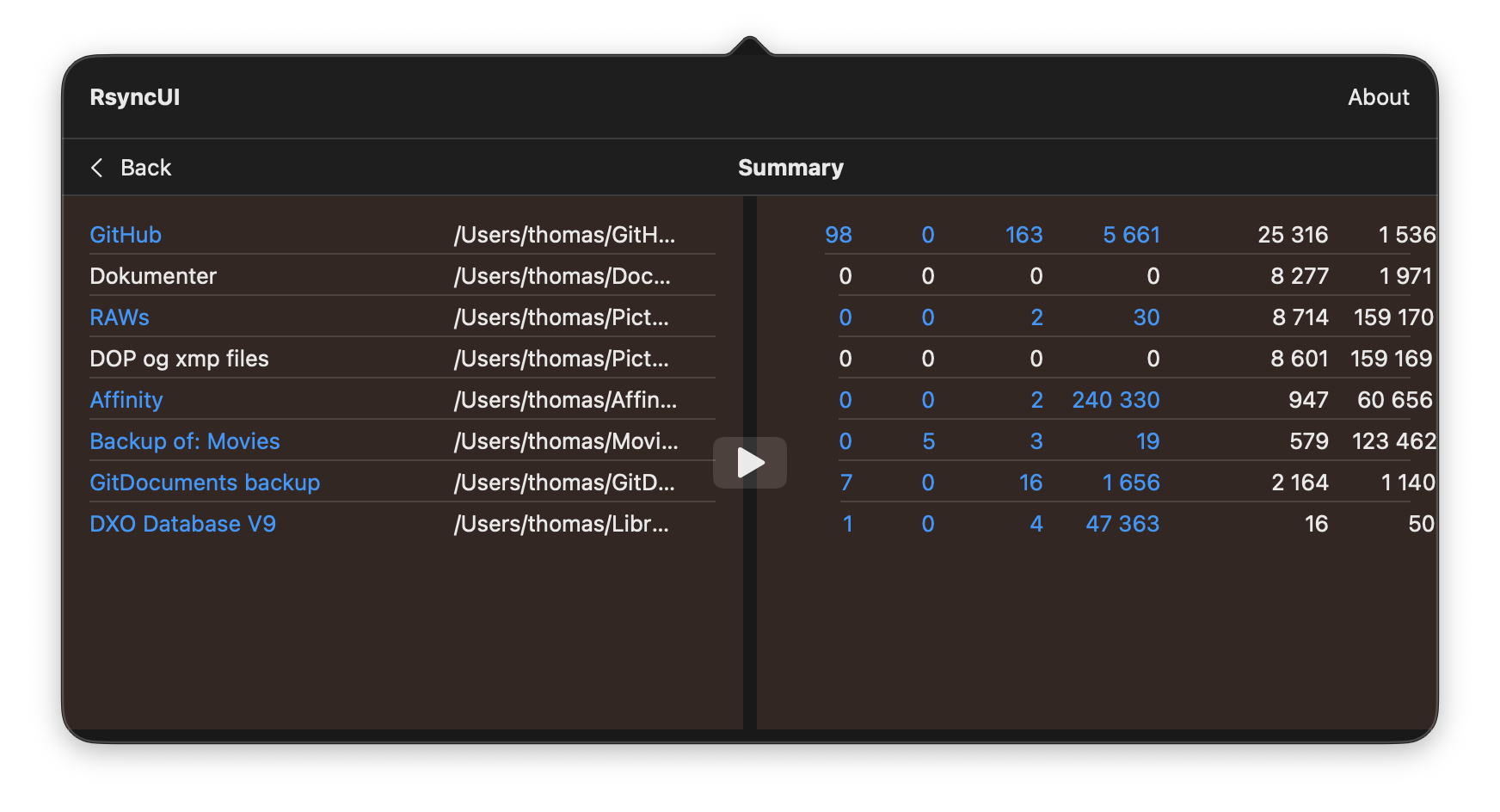 The codebase has been minimized, and all model and process code is shared with RsyncUI. Tables and data lists are converted to Lists, which, in my opinion, appear more visually appealing on a menu bar application.