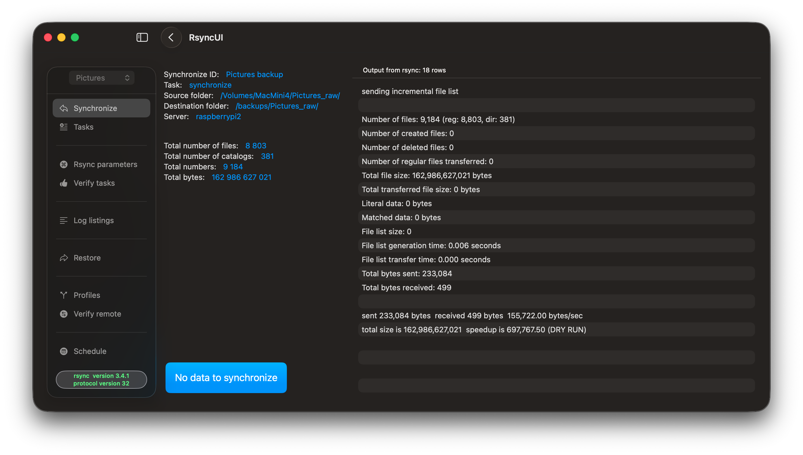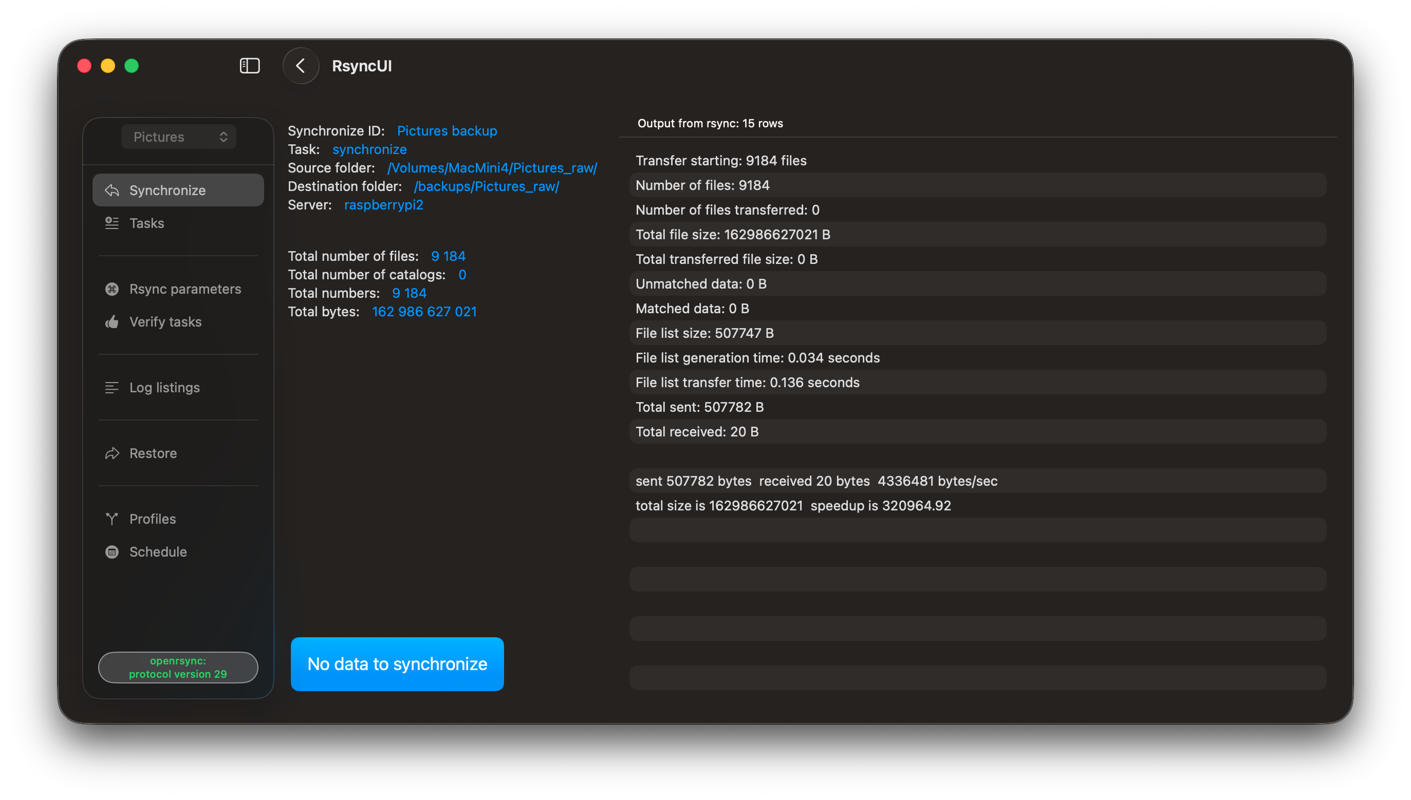 The preceding message serves as a cautionary note and a confirmation that all data has been synchronized. RsyncUI provides an indication of whether there is data to be transferred. Typically, the output from rsync is less than 20 rows if no data synchronization is required. Please refer to the following for further clarification: RsyncUI analyzes the summary output from rsync to identify data that needs to be synchronized or not. Occasionally, RsyncUI may detect that the number of lines from rsync exceeds 20, yet it still tags the data as not needing synchronization. This message serves as a reminder to verify that all data has been successfully synchronized.